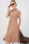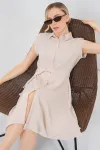 1677 Boydan Düğmeli Kuşaklı Elbise - Krem