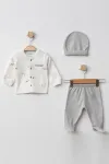 Erkek Bebek Animal Desenli Hırka Pantolon Bere 3  lü Alt Üst Bebek Takımı 0Ay-6Ay