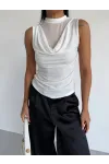 Kadın Beyaz Tül Detay Degaje Yaka Yanlardan Drapeli Sandy Bluz HZL26S-FRY123791