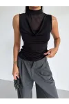 • Tül Detay Degaje Yaka Yanlardan Drapeli Sandy Bluz