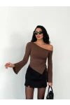 •  Asimetrik Kesim İspanyol Kol Beli Büzgülü Sandy Bluz