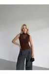 Kadın Kahverengi Tül Detay Degaje Yaka Yanlardan Drapeli Sandy Bluz HZL26S-FRY123791