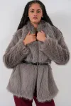 Kadın Kemerli Oversize Kürklü Kaban 9156 - Bordo