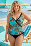 Kadın Mavi Siyah Tüy Desen V Yaka Yandan İp Büzgülü Büyük Beden Mayo HZL25S-LC4007