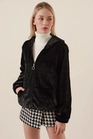 Kadın Siyah Bileği ve Beli Lastikli Fermuarlı Kapüşonlu Dışı Kürklü İçi Astarlı Mont HZL24W-BD151501