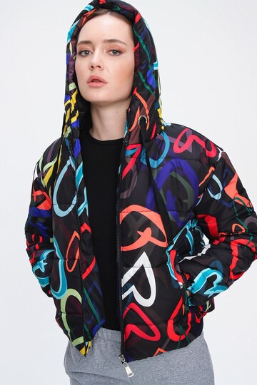 Kadın Siyah Kalp Desen Bel Büzgülü Kapüşonlu Şişme Mont HZL22W-BD151251