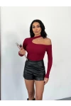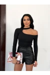 Kadın Siyah Tek Omuz Yırtmaç Detaylı Uzun Kollu Fitilli Kaşkorse Bluz HZL25W-FRY121531