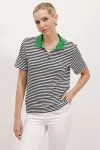 Kadın Yeşil Polo Yaka Fermuarlı Çizgili Tişört 0497