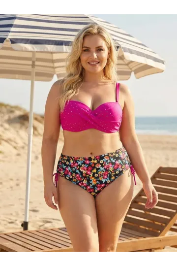 Kadın Fuşya Çiçek Desenli Taş İşlemeli Büyük Beden Astarlı Bikini Takım HZL25S-LC3312