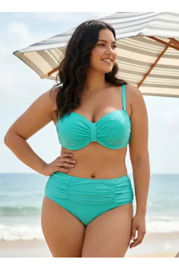 Kadın Turkuaz Taş İşlemeli Astarlı Büyük Beden Bikini Takımı HZL25S-LC01