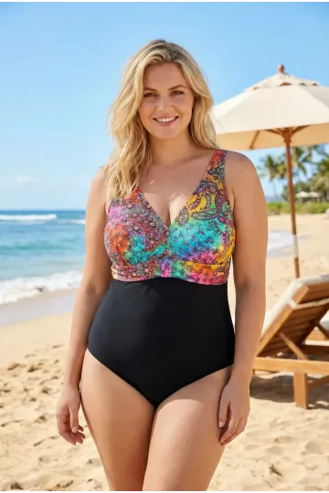 Kadın Siyah Çok Renkli V Yaka Büyük Beden Mayo HZL25S-LC4008