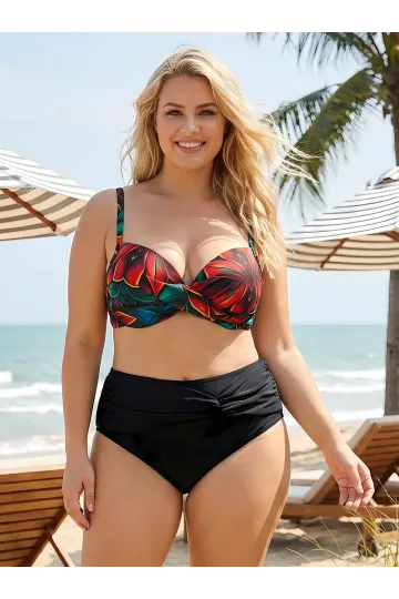 Kadın Siyah Kırmızı Çiçek Desenli Astarlı Büyük Beden Bikini Takımı HZL25S-LC24108