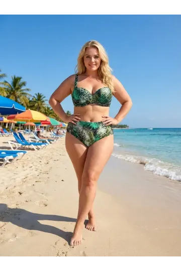 Kadın Yeşil Leopar Desenli Astarlı Büyük Beden Bikini Takımı HZL25S-LC25006