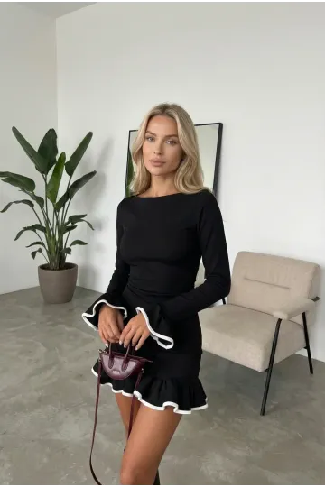 Kadın Siyah Uzun Kollu Volanlı ve Biyeli Dalgıç Kumaş Mini Elbise HZL25W-FRY123401