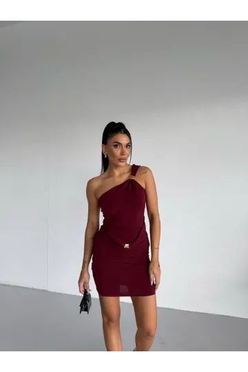 Kadın Bordo Tek Omuz Gold Aksesuarlı Sandy Mini Elbise HZL26W-FRY123781