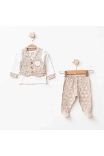 Erkek Bebek Ayı Nakışlı Sweatshirt Yelek Pantolon 3 lü Alt Üst Bebek Takımı 0 Ay - 6 Ay