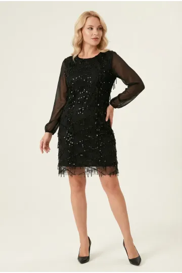 Kadın Siyah Büyük Beden Şifon Kol Saçaklı Payet İşlemeli Işıltılı Mini Abiye Elbise HZL26W-PR10091