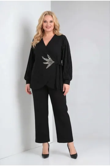 Kadın Siyah Büyük Beden Pliseli Kol İnci Detaylı Abiye Takım HZL26W-PR10111
