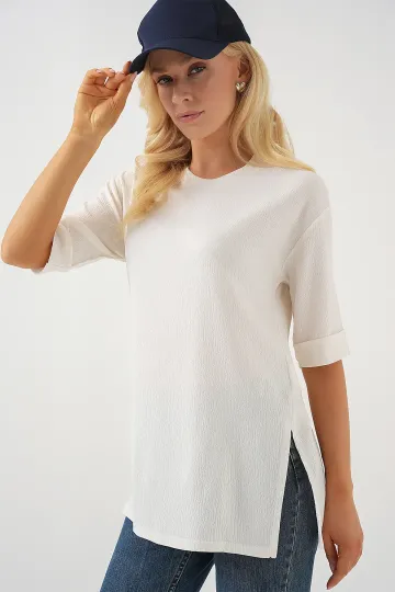 4332 Yanı Yırtmaçlı Örme Tişört - Beyaz