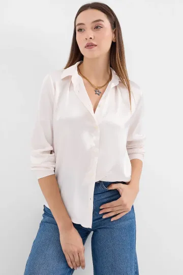 3964 Hafif Dökümlü Saten Gömlek - Krem
