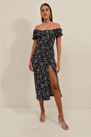 2396 Yırtmaçlı Yazlık Örme Elbise - Y.Siyah