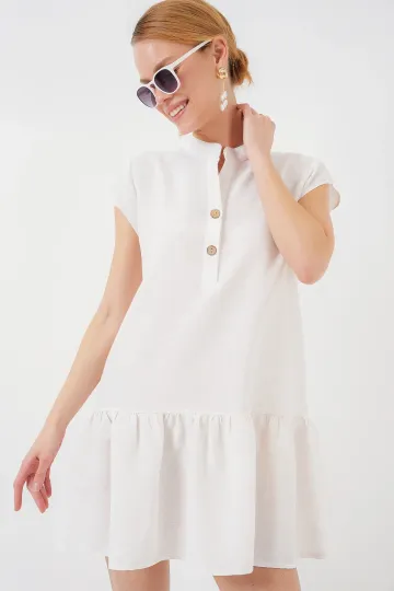 2425 Keten Mini Elbise - Ekru