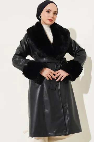 1026 Yaka Kürklü Kemerli Suni Deri Mont