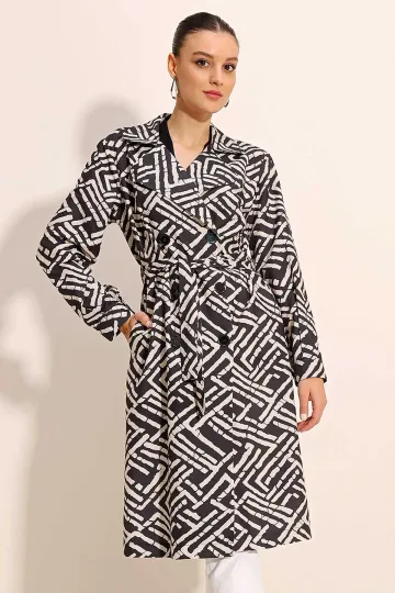 5853 Desenli Kruvaze Yaka Trençkot - C. Siyah