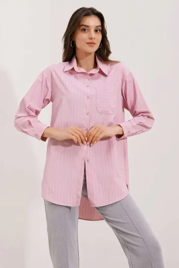 20217 Cep Detaylı Çizgili Oversize Gömlek - Pudra