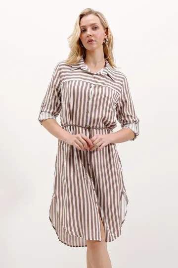 5629 Çizgili Kemerli Elbise - Vizon