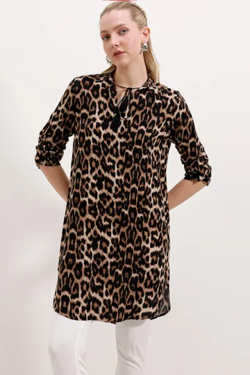 5613 Yaka Bağcıklı Çizgili Tunik - Kahverengi