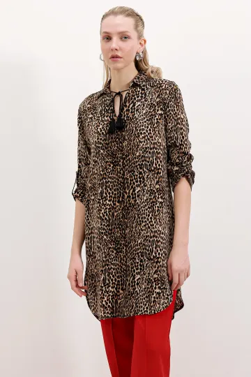 5613 Yaka Bağcıklı Çizgili Tunik - A.Kahve