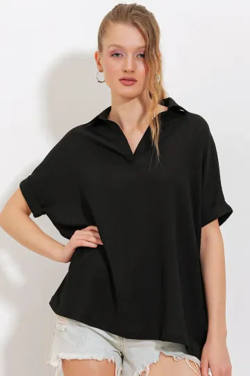 Kadın Siyah Oversize Polo Yaka Örme Bluz 0486