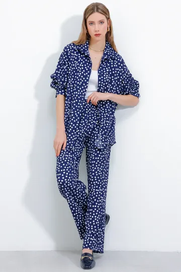 Kadın Puantiyeli Lacivert Ekru Örme İkili Takım 5858