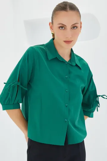 Kadın Kol Detaylı Zümrüt Yeşili Crop Gömlek 20246
