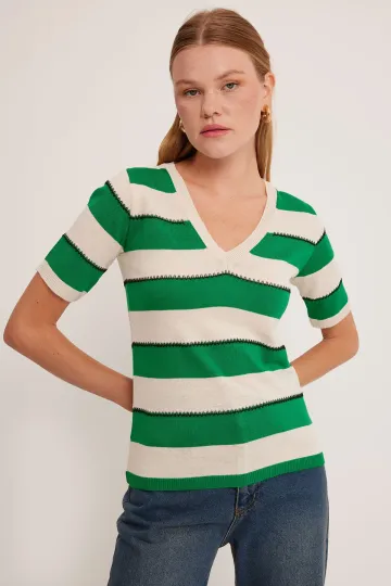Kadın V Yaka Yeşil Beyaz Çizgili Bluz 15869