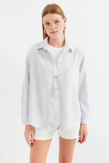 20212 Tek Cepli Çizgili Oversize Gömlek - Bej