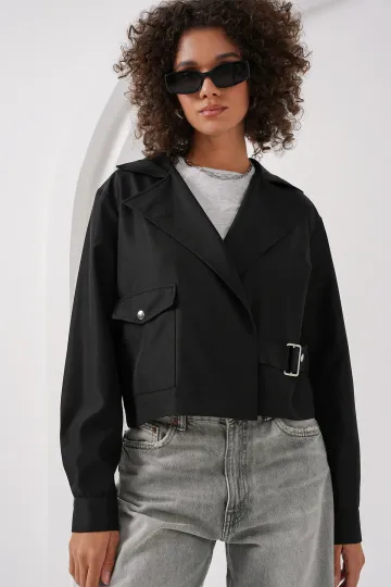 0712 Kruvaze Yaka Kısa Trençkot - Siyah