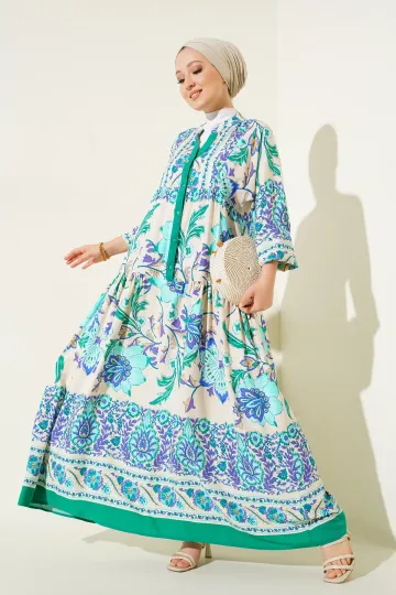 2423 Otantik Desenli Tesettür Elbise - M. Yeşil