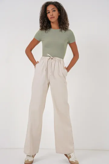 6690 Kadın Bol Paça Yüksek Bel Pantolon - Krem