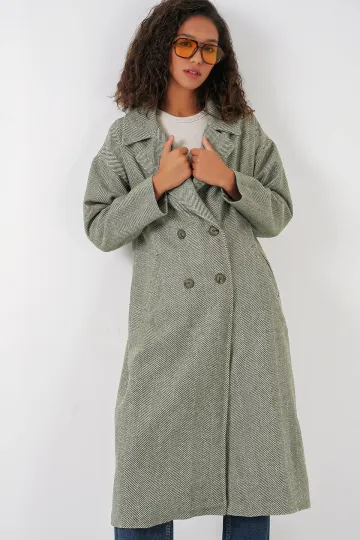 9113 Oversize Geniş Kesim Yünlü Uzun Kaşe Kaban - Çağla