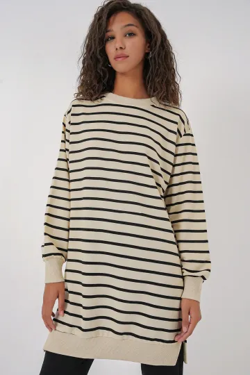 55452 Kadın Bisiklet Yaka Çizgili Tesettür Tunik - Siyah