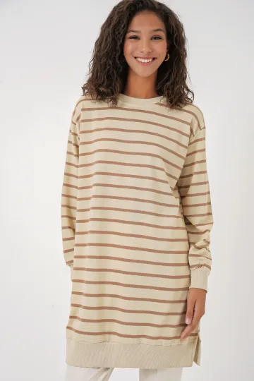 55452 Kadın Bisiklet Yaka Çizgili Tesettür Tunik - Bisküvi