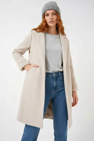 9145 Kadın Kolları Tüylü Balık Sırtı Kaşe Kaban - Krem