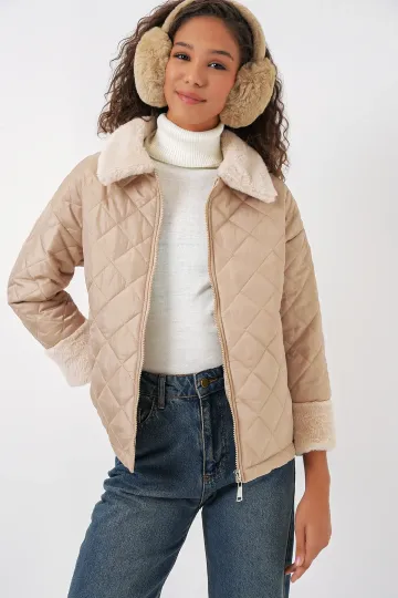 5202 Peluş Detaylı Kapitone Mont - Bej