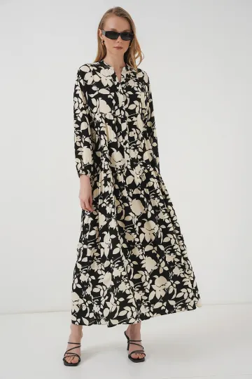 2423 Otantik Desenli Tesettür Elbise - Siyah - Beyaz1