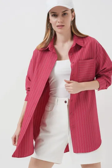 20217 Cep Detaylı Çizgili Oversize Gömlek - Kırmızı