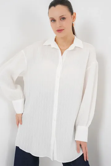 Kadın Çizgili Uzun Gömlek Tunik 5963 - Beyaz