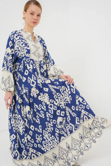 2423 Otantik Desenli Tesettür Elbise - İndigo 1