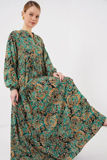 2423 Otantik Desenli Tesettür Elbise - Y. Su Yeşili